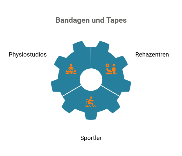 Bandagen und Tapes kommen vor allem in Physiotherapiepraxen, Rehazentren und Studios mit medizinischer Trainingstherapie zum Einsatz. Sie werden genutzt, um Verletzungen vorzubeugen, die Rehabilitation zu unterstützen oder gezielt Gelenke und Muskeln zu entlasten. Auch ambitionierte Sportler setzen auf professionelle Bandagen und Tapes, um ihre Leistungsfähigkeit zu erhalten und das Verletzungsrisiko zu minimieren – sei es bei intensiven Trainingseinheiten, Wettkämpfen oder zur Unterstützung nach einer Verletzung.