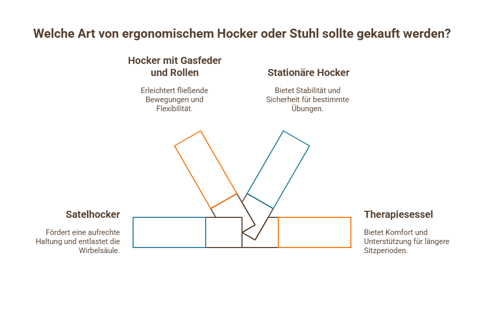 Das Angebot reicht von einfachen Rundhockern über ergonomische Satelhocker bis hin zu gepolsterten Therapiesesseln mit Rollen. Satelhocker fördern durch ihre besondere Sitzform eine aufrechte Haltung und entlasten die Wirbelsäule. Modelle mit Gasfeder und Rollen erleichtern fließende Bewegungsabläufe im Praxisalltag, während stationäre Varianten mit fester Sitzhöhe Stabilität und Sicherheit bei bestimmten Übungen bieten. Einige Hocker sind mit Fußringen, Rückenstützen oder neigbaren Sitzflächen ausgestattet, um sich individuellen Bedürfnissen anzupassen.