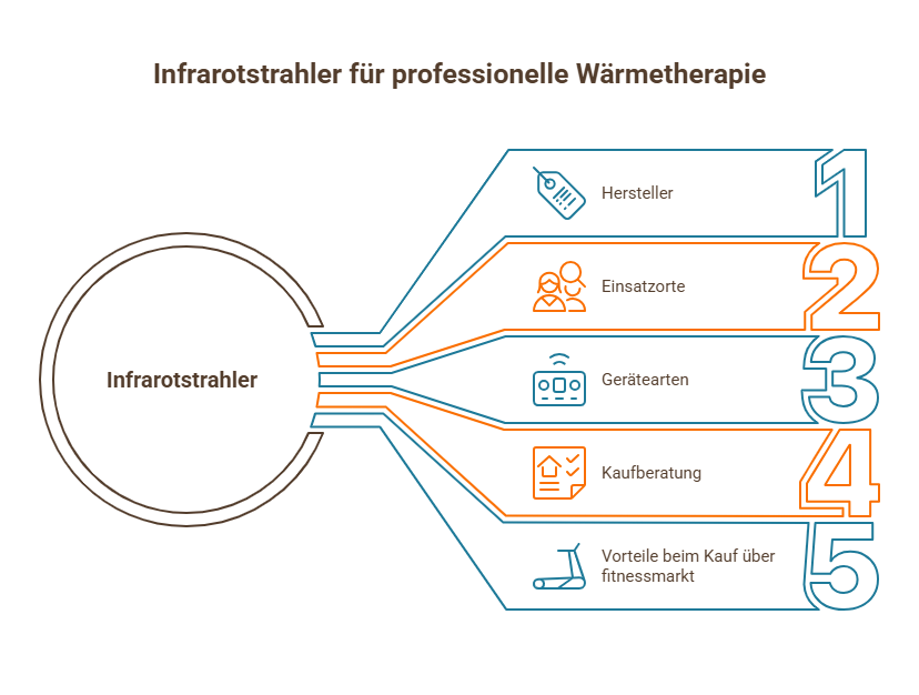 Infrarotstrahler erzeugen therapeutische Tiefenwärme durch Infrarotlicht und werden direkt auf bestimmte Körperregionen angewendet. Im professionellen Umfeld – etwa in Physiopraxen, Rehazentren oder Studios mit medizinischer Trainingstherapie – dienen sie der gezielten Lockerung von Muskulatur, Durchblutungsförderung und Schmerzlinderung. Im Vergleich zu klassischen Trainingsgeräten sind Infrarotstrahler passive Therapiesysteme, die keine Bewegung erfordern und optimal zur Vor- oder Nachbereitung weiterer Behandlungen geeignet sind.