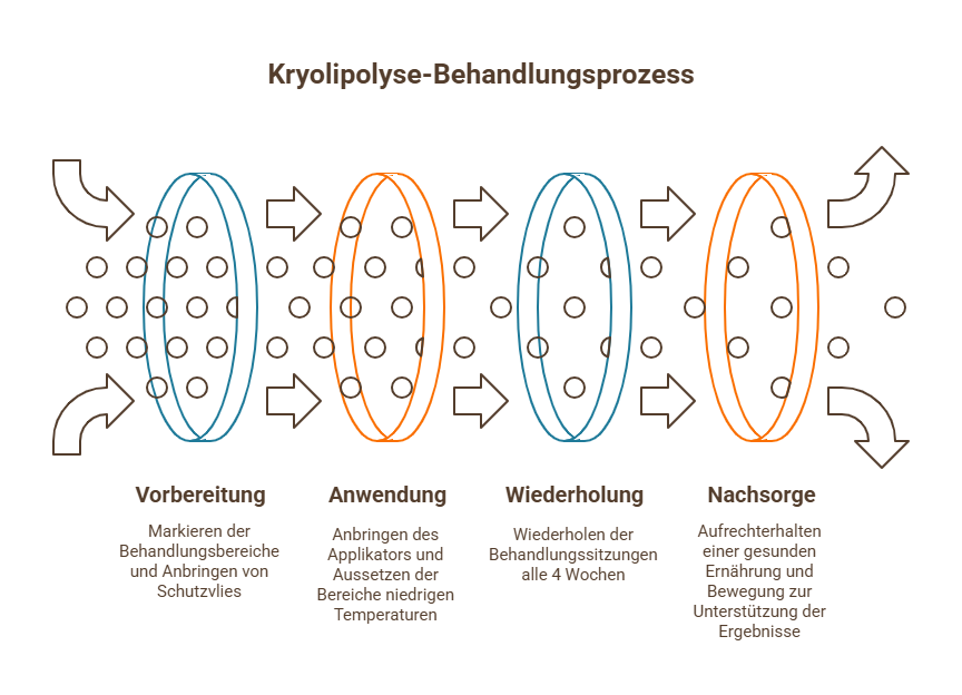 Bevor mit der Behandlung gestartet wird, werden die zu behandelnden Areale markiert und mit einem Kälteschutzvlies bedeckt. Der Applikator wird nun gezielt auf das Behandlungsareal gesetzt, welches unter Vakuum angesaugt und einer Temperatur von etwa -4 Grad bis -10 Grad ausgesetzt wird. Sensoren im Applikator geben stetig und gezielt Temperatur auf das Areal ab. Anders als einige befürchten, wird das umliegende Gewebe, die Haut, Nerven, sowie die Muskeln beim Gefrierungsprozess nicht beschädigt! Es kommt daher auch zu keiner Narbenbildung unter der Haut.