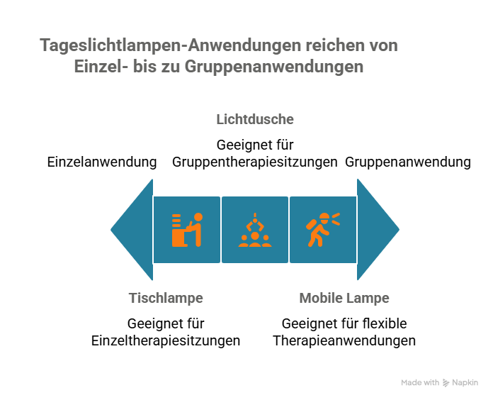Profis wählen zwischen Tischgeräten für Einzelplätze, großflächigen Lichtduschen für Gruppenanwendungen und mobilen Varianten für flexible Therapie. Geräte mit Einstellung der Lichtintensität, Timer, automatischer Abschaltung und UV-Filter erfüllen höchste ergonomische und sicherheitstechnische Ansprüche. Je nach Modell und Einsatzbereich ermöglicht die Variation von Beleuchtungsstärke und Bestrahlungsdauer eine präzise Anpassung an individuelle Bedürfnisse.