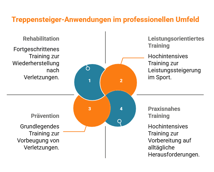 Professionelle Treppensteiger werden vor allem in Physiotherapiepraxen, Rehabilitationszentren und medizinisch ausgerichteten Fitnessstudios eingesetzt. Hier helfen sie beim gezielten Muskel- und Kraftaufbau nach Verletzungen, trainieren Koordination und Gleichgewicht und unterstützen Patienten dabei, alltägliche Bewegungen wie das Treppensteigen sicher wieder zu erlernen. Auch ambitionierte Sportler nutzen Treppensteiger zur Steigerung der Leistungsfähigkeit oder zur Vorbereitung auf besondere Herausforderungen. Privatnutzer mit Rehabezug oder funktionellen Trainingszielen profitieren von der gelenkschonenden, sicheren Bewegung und der realitätsnahen Trainingsweise.