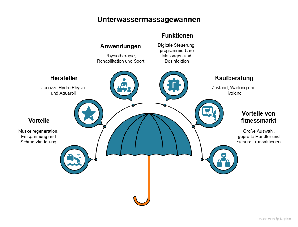 Professionelle Unterwassermassagewannen findest du von spezialisierten Marken wie Jacuzzi, Hydro Physio und Aquaroll. Diese Hersteller stehen für innovative Technologien, langlebige Bauweise und erstklassige Massagewirkung. Gerade im gewerblichen Einsatz überzeugen sie durch hohe Sicherheit, einfache Bedienung und effektive Funktionsvielfalt, die eine individuelle Anpassung an verschiedene Therapieziele erlaubt.