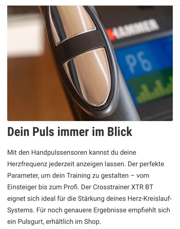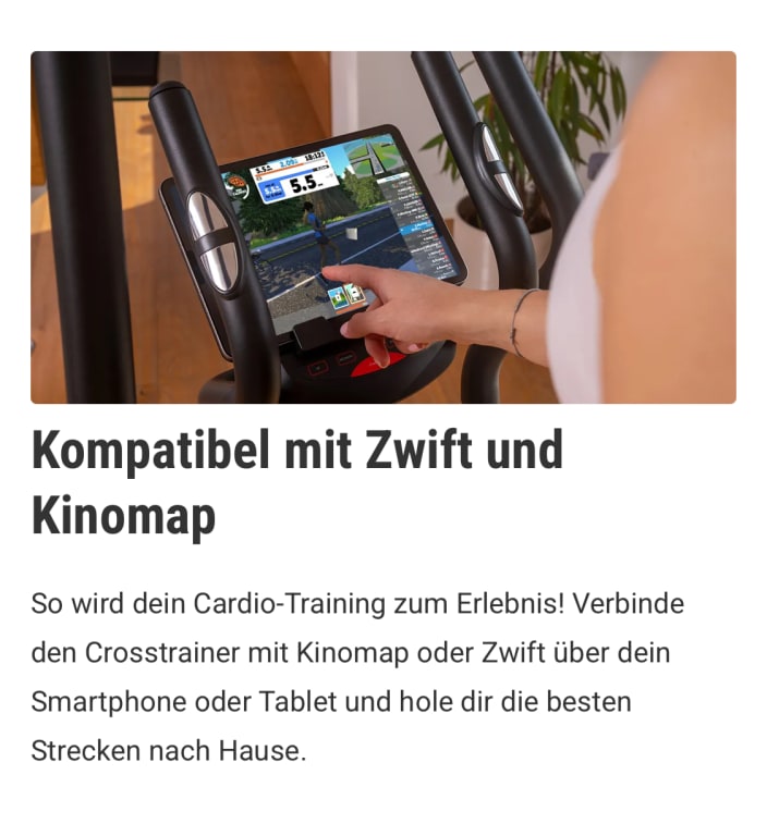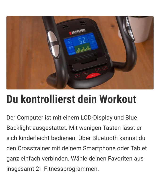 Verkaufe hier einen neuen Crosstrainer von HAMMER - „Crosstech XTR BT Glute Shaper mit Zwift und Kinomap“. Er wurde nur einmal ausprobiert und ist in einem einwandfreien Zustand ohne Gebrauchsspuren und voll funktionsfähig. Inklusive Gerätematte.