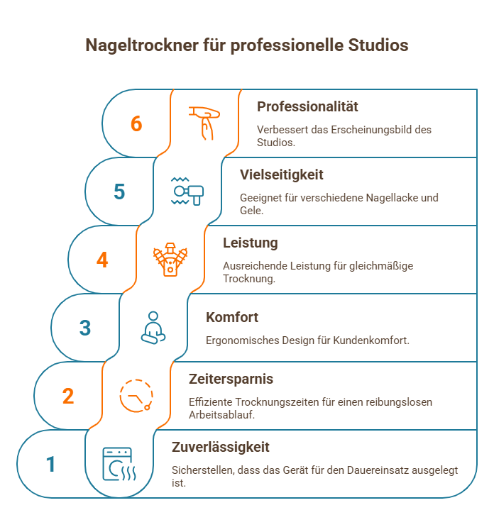 Ein moderner, sauberer und funktionaler Nageltrockner trägt spürbar zum professionellen Gesamteindruck deines Studios bei. Kundinnen und Kunden nehmen wahr, ob das Gerät bequem ist, ausreichend Platz für Hände oder Füße bietet und die Behandlungssituation komfortabel wirkt. Ein wertig aussehender Nageltrockner, der optisch zu deiner restlichen Ausstattung passt, unterstützt deine Positionierung als modernes, sorgfältig ausgestattetes Studio und stärkt das Vertrauen in deine Arbeitsqualität.