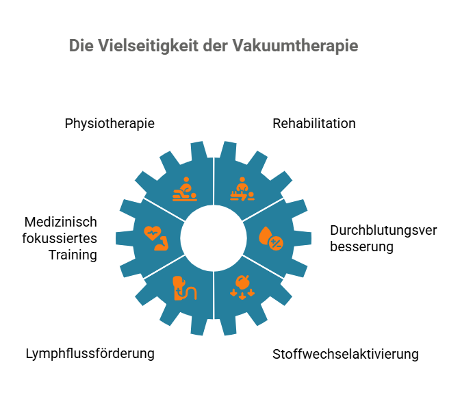 Die Vakuumtherapie kombiniert gezielte Unterdruckphasen mit Mobilisations- oder Ruhezuständen, was die Durchblutung, Lymphdrainage und Regeneration stärken kann. Sie zeigt oft schnellere Entstauungs- und Heilungseffekte als reine Massage- oder Bewegungstherapie und eignet sich besonders für Patienten mit venösen Rückflusstörungen, nach Sportverletzungen, bei chronischer Schwellungsneigung oder zur Stoffwechselaktivierung in der Rehabilitation und im Leistungssport.